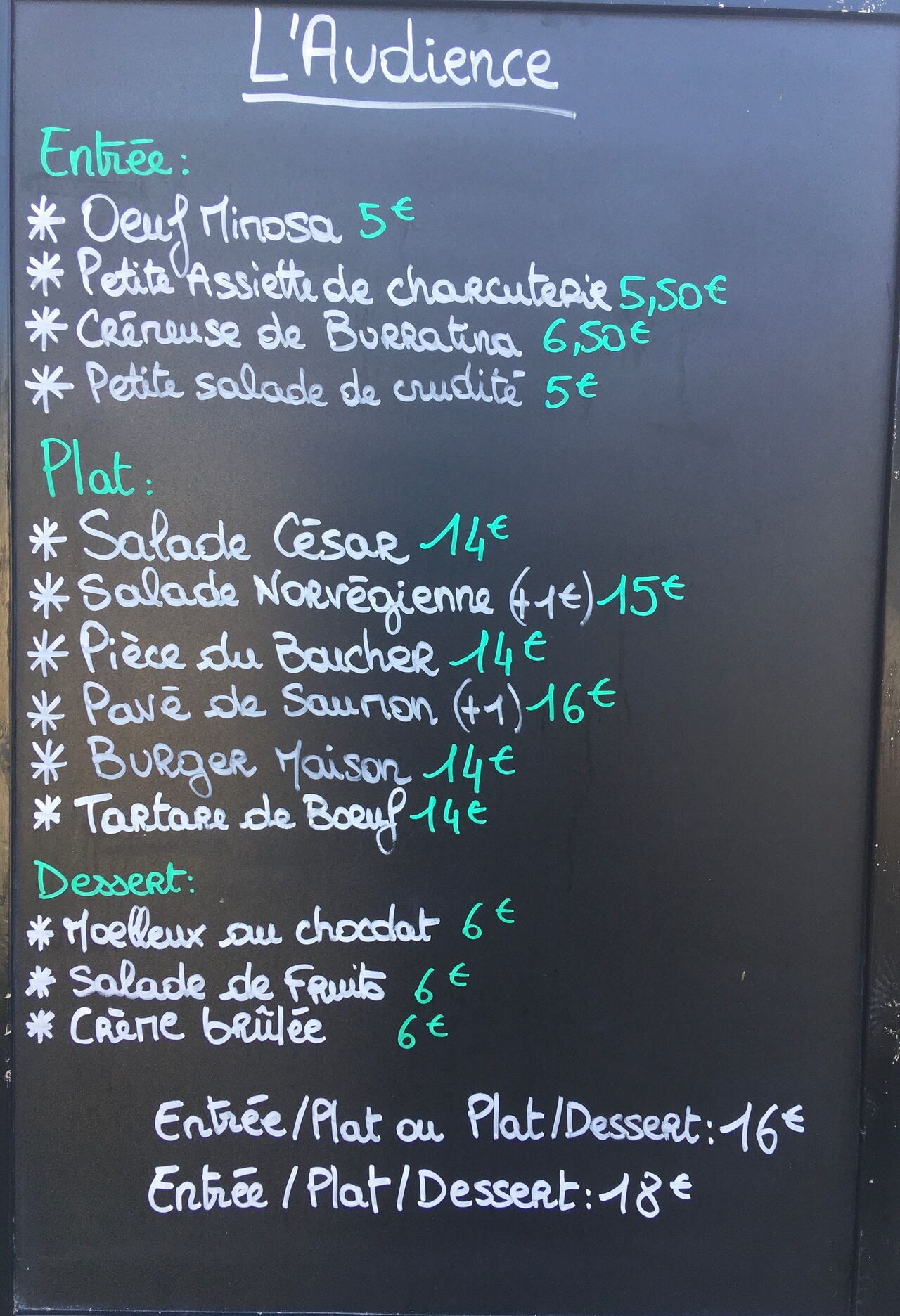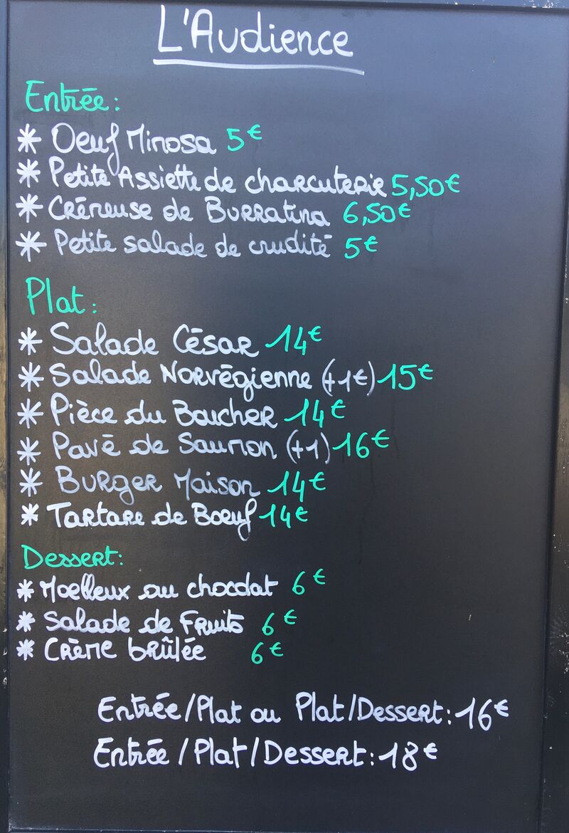 Souhaitez-vous passer une soirée agréable et conviviale autour d’un repas français fait maison dans notre restaurant ? Bienvenue dans le « L'AUDIENCE ». Profitez de nos plats savoureux et de la superbe ambiance de notre restaurant. Profitez du soleil sur notre terrasse très belle. Offrez-vous une pause déjeuner spéciale ou invitez vos partenaires commerciaux à déjeuner. Notre carte répond à tous les goûts.